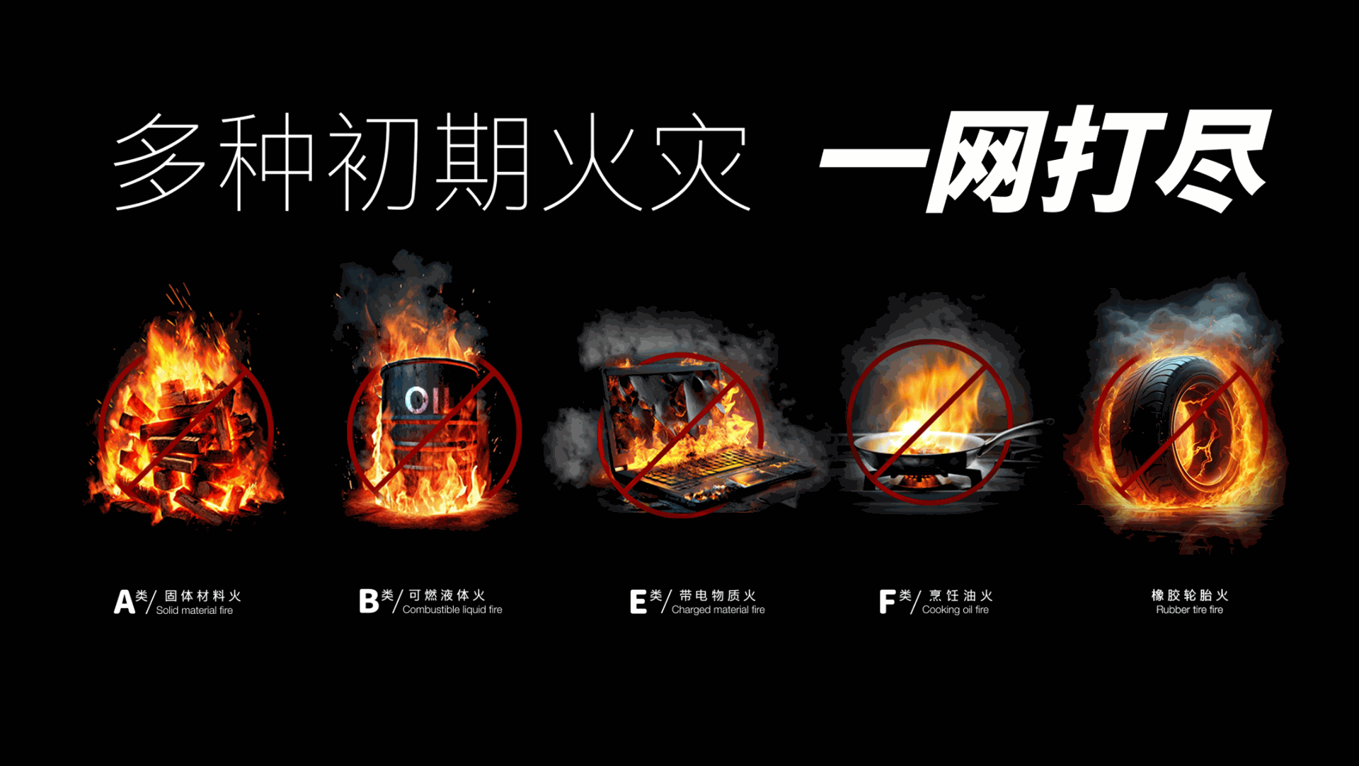 它灭火高效,能在20秒内扑灭8L油火,喷射距离达4米,且抗复燃性强。可覆盖A、B、E、F类初期火灾,并具备火场自救功能。